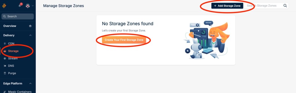 2. Once logged in, go to “Storage” and click on “Create Your First Storage Zone” or the “Add Storage Zone” button.