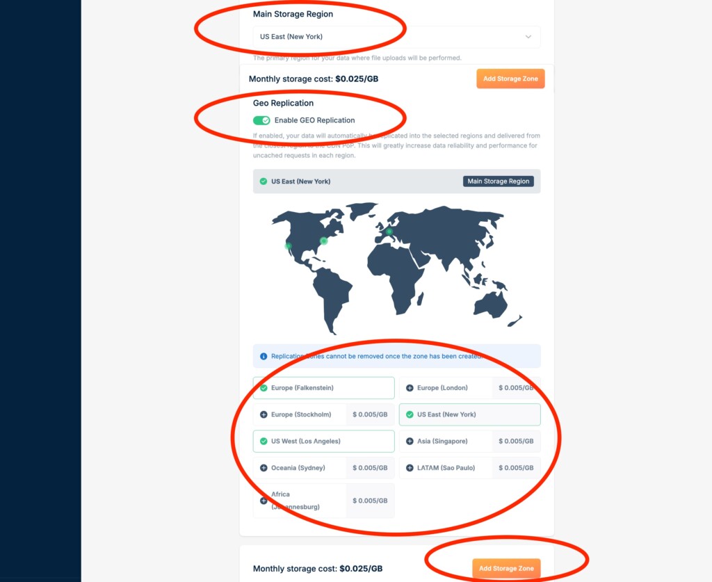 4. In “Main Storage Region”, select your region. For example, if you live on the East Coast, select “US East (New York)”. Keep “Geo Replication” ON, select additional regions such as “US West (Los Angeles)”, and click “Add Storage Zone”.