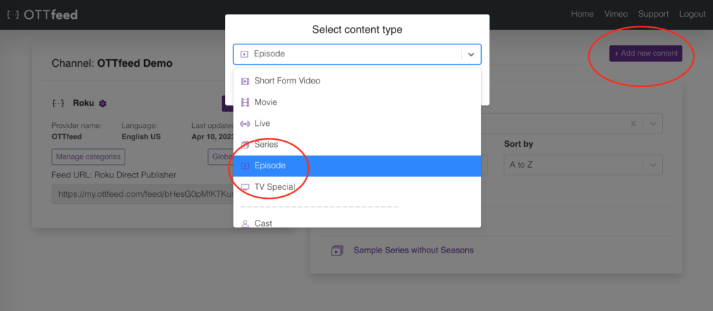 To create an episode, click on the “add new content” on the homepage, select episode from the dropdown, and click “Go”.
