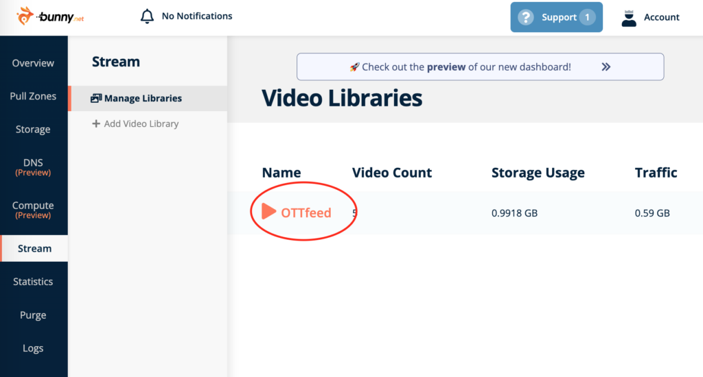 1. Go to “Stream” and click on your video library (e.g., OTTfeed).