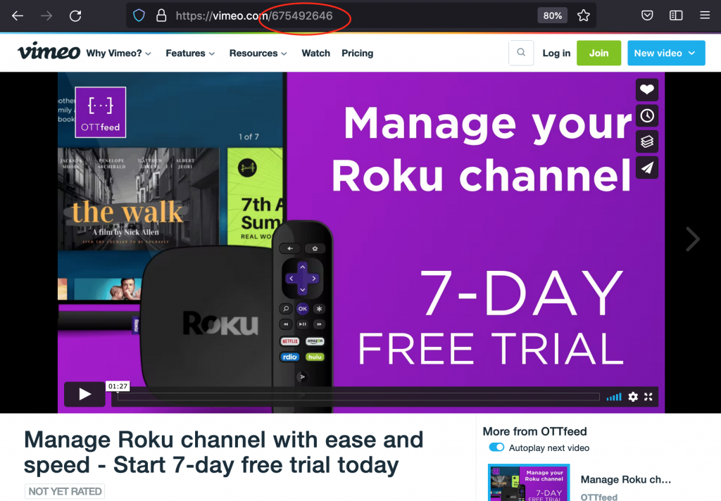 - Find your video ID: To find your video ID, go to your video page on Vimeo and copy the 9 digits in the URL. For example, the video ID for the following video “https://vimeo.com/675492646” will be 675492646.