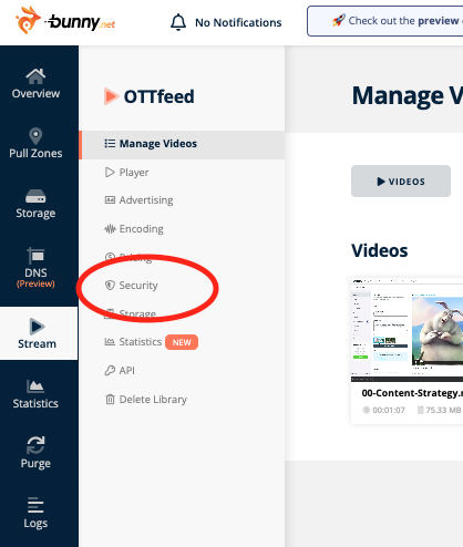 4. Click on your video library (e.g., OTTfeed) and then on “Security”.